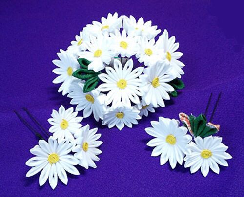藤代工房に納品してきました。 途中 ホームページの更新も入り直前までバタバタしてしまいました。 今回納品した中で特に私が気に入っているマーガレットのかんざし。 同じものですが下地を変えて撮ってみました。 かんざしに時間が取られパッチン留めはこれ…